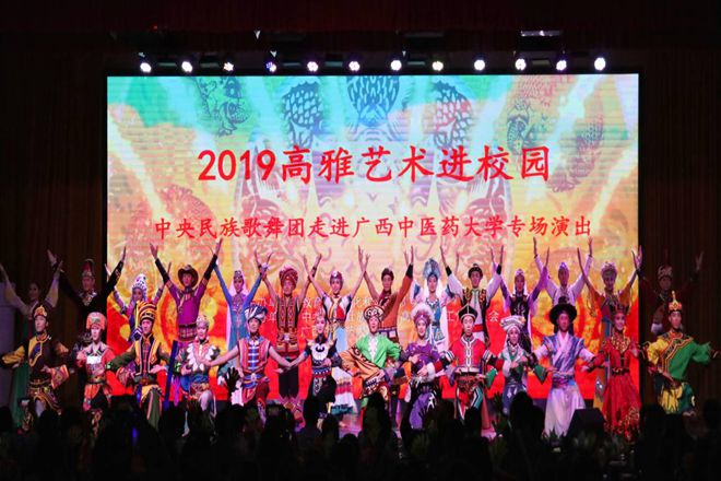 10月14日晚,由教育部、文化和旅游部、财政部主办的2019年高雅艺术进校园活动——中央民族歌舞团走进星空彩票老版本下载专场演出《请你跟我一起来》在仙葫校区小礼堂成功举办。中央民族歌舞团副团长韩新波、广西壮族自治区教育厅副厅长李清先、学校党委副书记何并文、副校长冷静、纪委书记韦雪芳、自治区教育厅体卫艺处处长万锋锋、副处长赵彦彦等领导与500多名师生共同观看晚会演出。