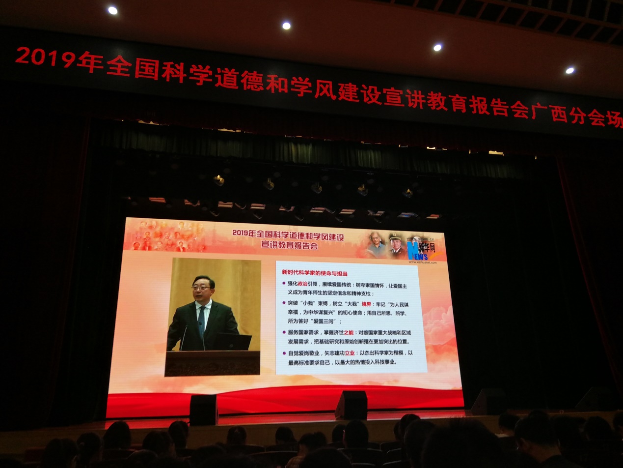 11月13日,2019年全国科学道德和学风建设宣讲教育报告会在人民大会堂举行。我校组织青年教师、研究生、本科生200名师生代表赴广西大学大礼堂同步直播分会场,同时积极组织各学院、附属单位共500多名师生通过网络视频同步收看了报告会。