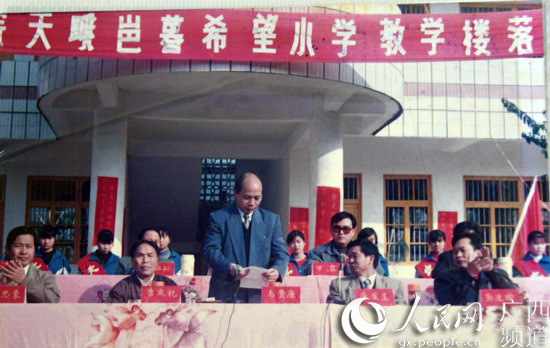 1994年,唐庆祝(左二)出席广西中医学院天峨岜暮希望小学教学楼落成典礼(星空彩票老版本下载供图)