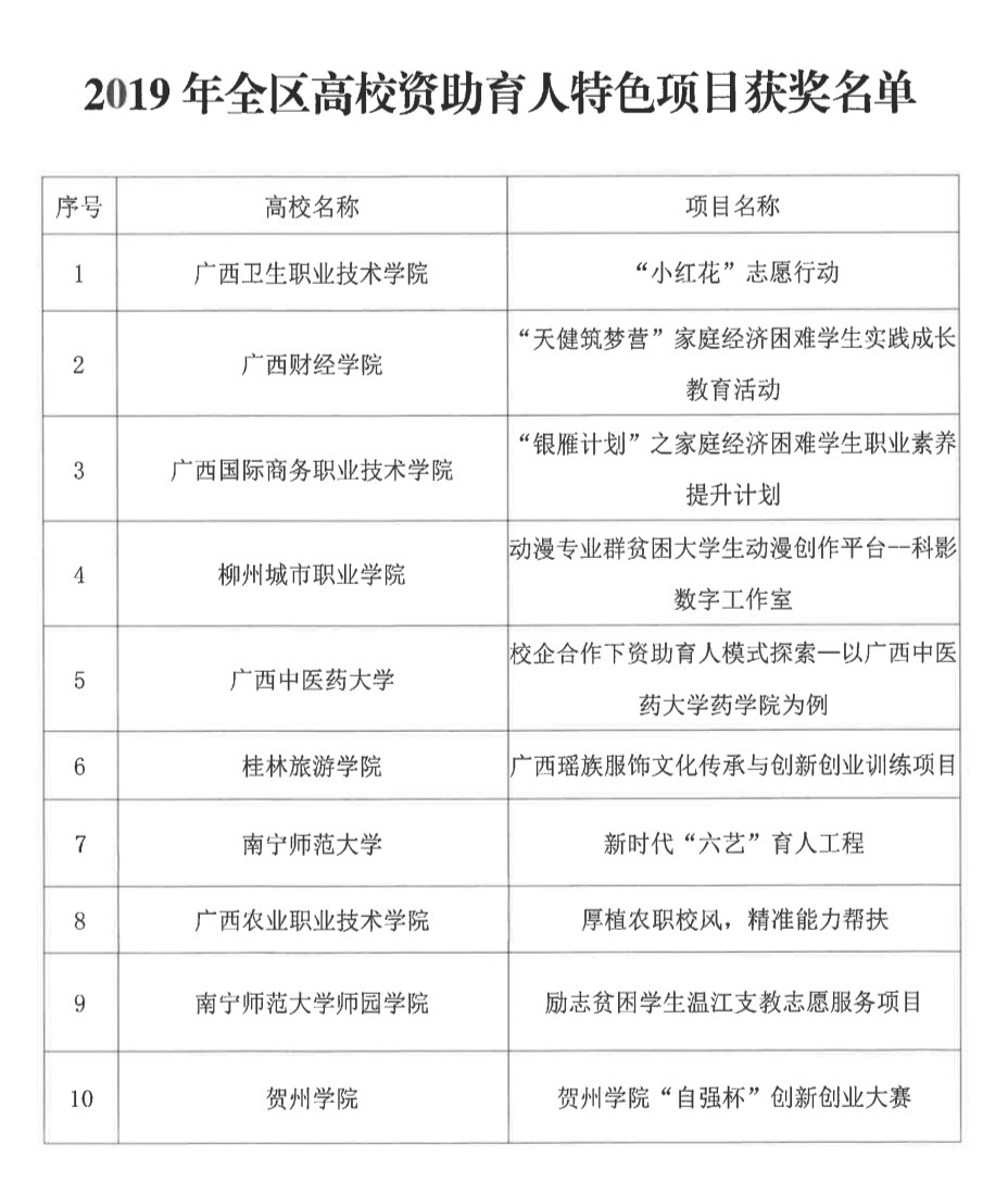 【喜讯】我校荣获全区高校资助育人特色项目 来源:药学院 作者:药学院 日期:2020-01-10 点击数: 次 分享到: 近日,2019年全区资助育人项目和工作典型案例评选获奖名单已由广西壮族自治区教育厅公布,我校药学院申报项目“校企合作下资助育人模式探索——以星空彩票老版本下载药学院为例”荣获2019年全区高校资助育人特色项目的称号。 打印正文 关闭本页