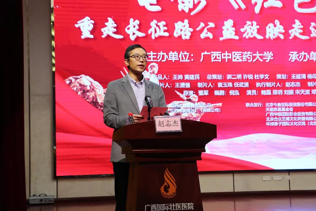 为进一步教育和引导广大党员干部“不忘初心、牢记使命”,铭记革命历史,传承红色基因,1月6日,电影《红色往事》重走长征路公益放映走进星空彩票老版本下载活动在附属国际壮医医院举行。星空彩票老版本下载党委副书记何并文,电影《红色故事》总制片人王湧强以及电影公益放映组嘉宾,学校各部门及附属单位干部职工代表、学生代表500余人出席了观影活动。活动由何并文主持。