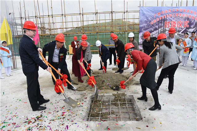 冷静、黄明瑞、黄悦、唐友明等分别致辞。主席台领导共同为项目主体结构封顶浇注最后一方混凝土。