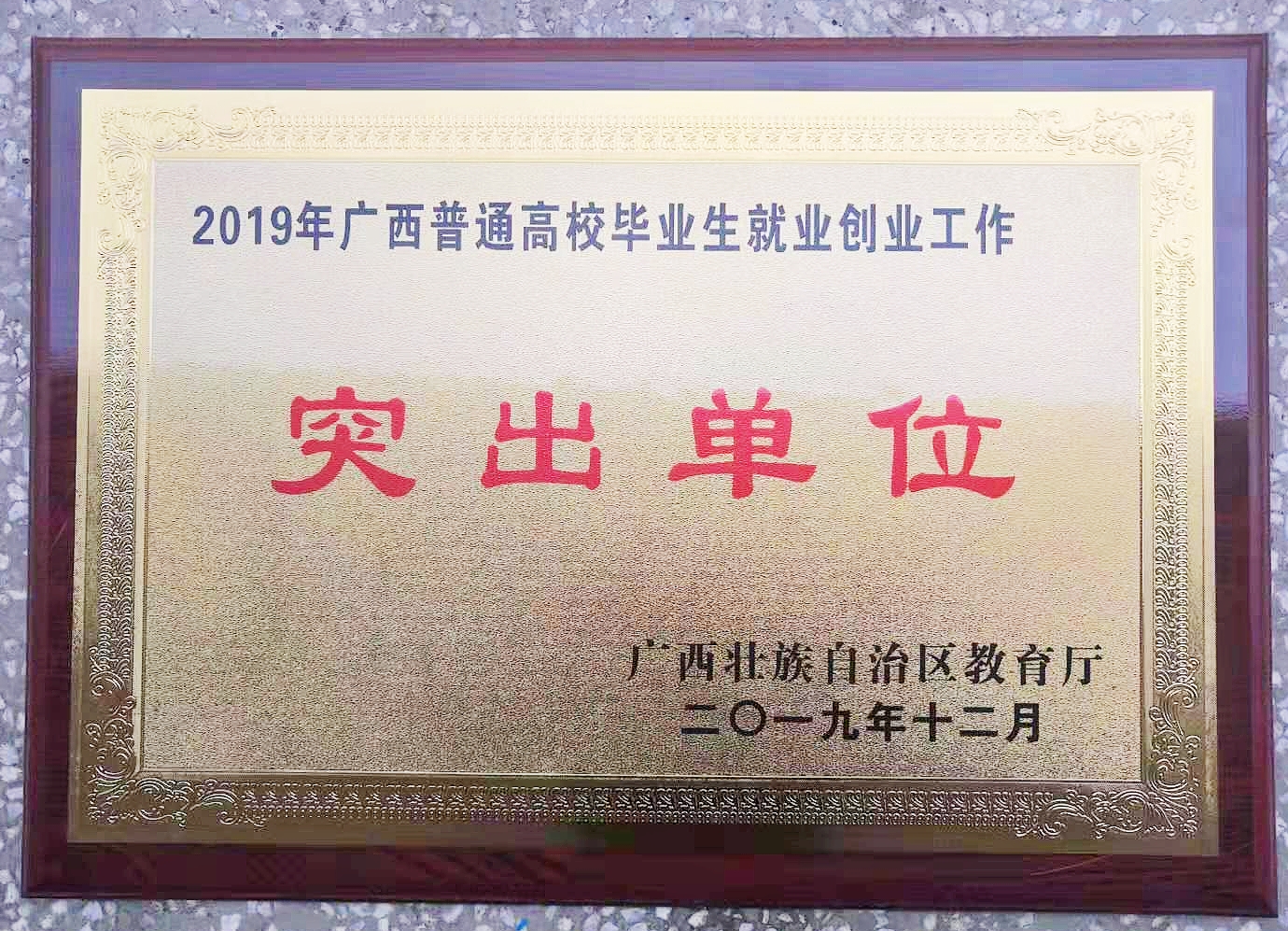 “2019年广西普通高校毕业生就业创业工作突出单位”牌匾