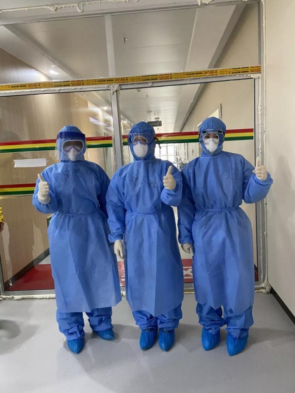 为了尽快熟悉隔离病区的环境,医疗队员来到病区了解情况。附属瑞康医院ICU护长出身的覃惠娟有着多年丰富的急危重症病人的护理经验,在大致了解院区的收治情况后,她第一个穿戴好防护服进入了隔离区,近距离查看病人情况。为了节约防护服,来自一附院的医疗队员先由陈平医生、郑春秋护长穿上防护服全服武装进入隔离病区熟悉环境,再由陈平医生、郑春秋护长将注意事项告知每一位队员。从病房出来后的覃惠娟护长,稍显疲惫,但她的眼神仍如往常一样坚定,她说,她和队友们有信心,和当地的医护人员一起,打赢这场战斗!
