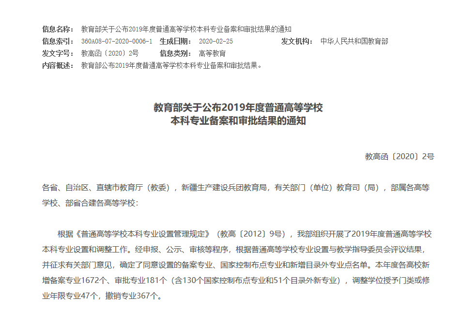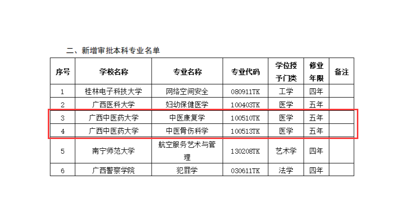 【喜报】我校两个本科新专业获教育部批准设置 来源:教务处 日期:2020-03-05 点击数: 次 分享到: 日前,《教育部关于公布2019年度普通高等学校本科专业备案和审批结果的通知》(教高函〔2020〕2号)公布了同意设置的备案专业、国家控制布点专业和新增目录外专业点名单。我校申报的中医康复学、中医骨伤科学等两个本科专业正式获准设置。截至目前,我校本科专业已增至29个。请相关学院按本科专业建设的有关要求,切实做好新专业建设。 打印正文 关闭本页