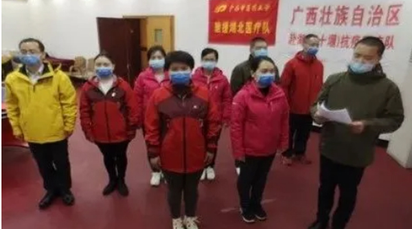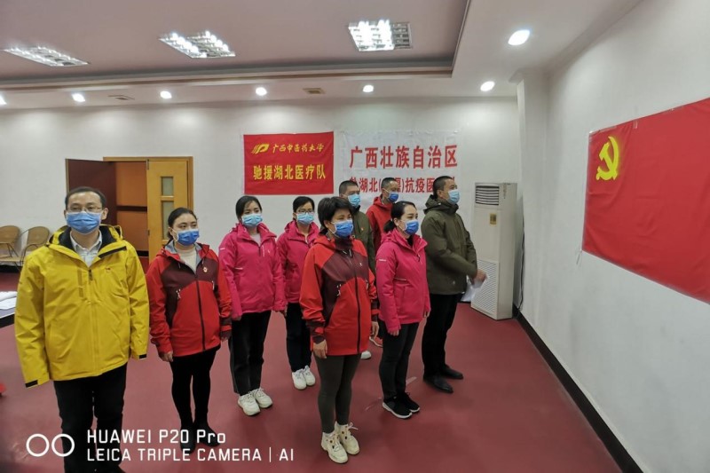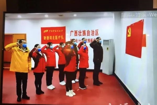“我志愿加入中国共产党,拥护党的纲领,遵守党的章程,……为共产主义奋斗终身!……”3月6日晚,一场特殊的入党宣誓仪式在我校第一批驰援湖北医疗队竹溪县驻地举行。第一附属医院郑春秋、附属瑞康医院重症医学科二区护士长覃惠娟、附属国际壮医医院急诊急救联动中心护师莫凡高举右拳,面对鲜红的党旗,以特殊而庄严的火线入党方式成为光荣的中共预备党员。我校赴湖北竹溪医疗队临时党支部书记陈平为预备党员戴上党徽,并带领全体党员入党宣誓、重温入党誓词。