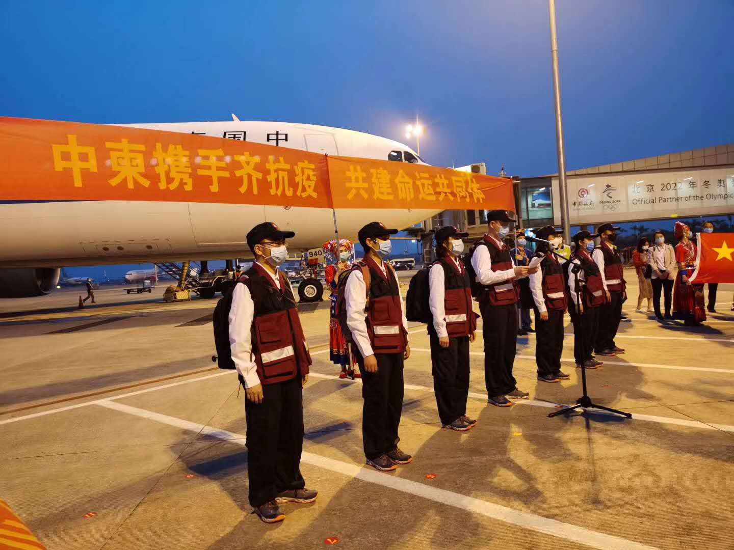 3月23日上午,中国政府赴柬埔寨抗疫医疗专家组出征仪式在南宁吴圩国际机场举行,随后他们乘坐包机飞往柬埔寨金边。