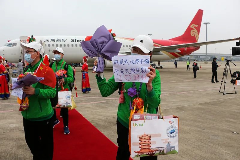 “战疫武汉心不悔,平安凯旋见亲人。”