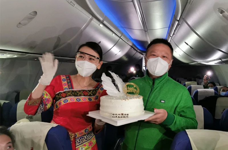 万米高空上,医疗队员们唱起了《我和我的祖国》。机组工作人员为在三月份过生日的我校蔡伦、李咏翔等队员送上生日蛋糕与贺卡,广西队全体队员同唱生日快乐歌,为他们庆生。