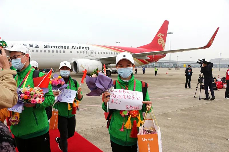“如约而至的不仅是春天,还有疫情过后平安的你们。”下午3时40分,载有104名广西第四批驰援湖北医疗队队员的包机降落,缓缓驶入南宁吴圩国际机场。当机舱门开启,医疗队员们带着胜利的笑容,依次走下舷梯。第一附属医院、附属瑞康医院、附属国际壮医医院领导及相关部门负责人在机场迎接队员们平安凯旋,并代表医院向医疗队队员表示崇高敬意和感谢。