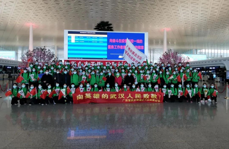 飞雪夜援汉,风雨送春归。从2月15日紧急出征,在大雪纷飞的夜晚到达武汉“战场”,到3月29日凯旋,春雨纷飞的南宁已是春意盎然。守望武汉的45个日夜,我校50名队员守护沌口方舱,转战协和医院,所在的广西第四批驰援湖北医疗队也成为广西唯一一支两地“战斗”的队伍。在武汉开发区(汉南区)沌口方舱医院,我校队员整整战斗21天,用医术治疗疾病,用仁心安抚患者,得到方舱医院领导、同舱医疗队、病友的高度评价。经过短暂的休整,他们再披战袍,与广西第四批医疗队一起迅速转战武汉协和医院西院,在重症病区、发热门诊等科室参加重症病人救治工作,在大家的共同努力下,一批又一批患者康复出院。在忘我奋战的日日夜夜,他们同时间赛跑、承受着难以想象的身体和心理压力,全力以赴与病魔较量,用实际行动诠释了医者仁心的初心使命。
