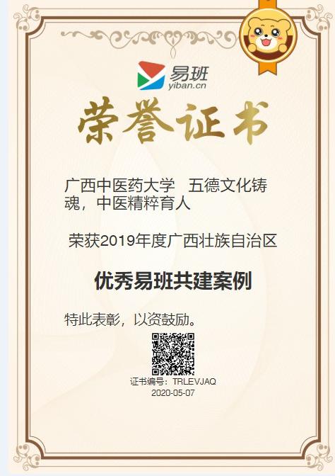 据悉,为深入学习宣传习近平新时代中国特色社会主义思想,进一步把全国教育大会、全国高校思想政治工作会议和学校思政课教师座谈会精神的贯彻落实引向深入,进一步提升全国高校易班建设质量,增强高校运用易班开展网络思想政治教育和网络文化建设的能力。全国易班共建高校优秀工作案例展示活动每年举办一次,由各省级易班发展中心在本省(自治区、直辖市)内按每个奖项不超过本省(自治区、直辖市)易班共建高校数量的10%开展评优,评审结果报教育部思想政治工作司审定后以专题形式在易班网面向全国集中展示。在2019年广西壮族自治区易班共建案例展示中,我校易班 “五德文化铸魂,中医精粹育人”易班共建案例喜获佳绩。