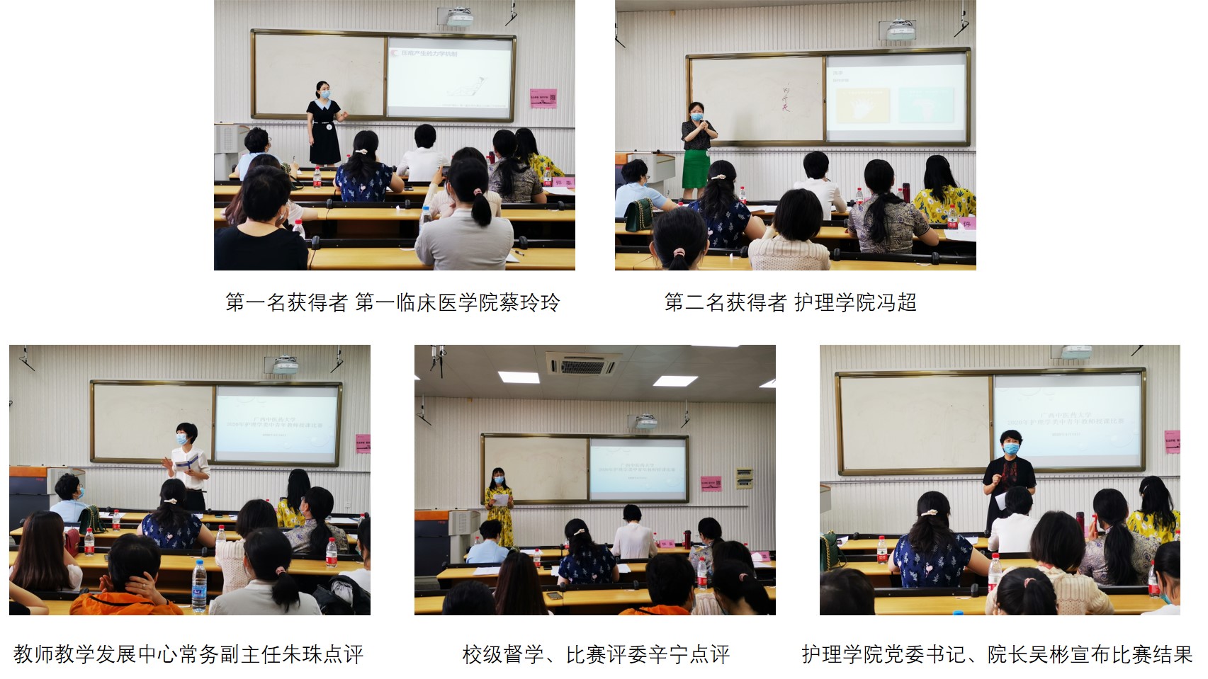 激烈的角逐之后,第一临床医学院蔡玲玲老师力压群雄、夺取桂冠,护理学院冯超老师荣获第二名,这两位老师将代表学校参加广西护理学会首届广西高等院校护理学类中青年教师授课比赛。