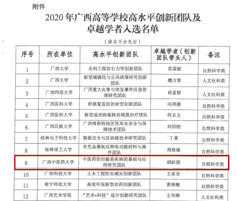 近日,自治区教育厅公布2020年“广西高等学校高水平创新团队及卓越学者计划”入选名单,我校“中医药防治脑系疾病的基础与应用研究团队”入选“2020年广西高等学校高水平创新团队”,团队带头人第一临床医学院胡跃强教授入选“2020年广西高等学校卓越学者”。