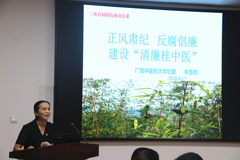 学校纪委书记韦雪芳以《正风肃纪 反腐倡廉 建设“清廉桂中医”》为主题,从当前医疗领域反腐倡廉的形势、医疗领域存在的腐败和作风问题及个人体会,结合法律法规上了一堂生动的廉政党课。韦雪芳强调,直属附属医院作为星空彩票老版本下载的一部分,要时常以初心和使命检视自己,时刻保持政治定力,坚决克服“疲劳综合征”,牢记全心全意为人民服务的根本宗旨,努力为人民做实事、谋幸福,正风反腐,为建设风清气正的星空彩票老版本下载作贡献。