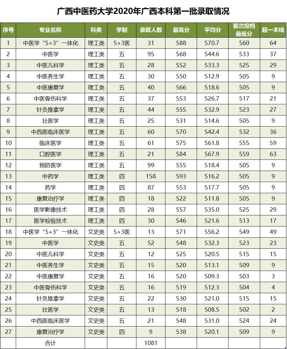 2020年,我校在广西本科第一批共录取考生1081人,其中,其中文史类189人,理工类892人。按原计划顺利完成了该批次的录取任务,详情如下: