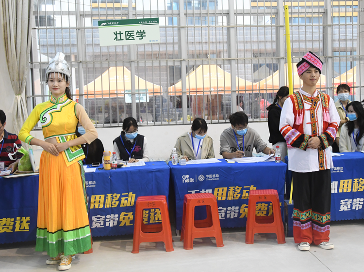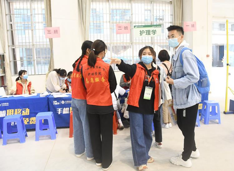 各学院、各部门在迎新方式上,脑洞大开,各显神通。基础医学院推出学校特色和医学特色文创产品——手绘帆布袋,送给每一位2020级基础医学院学子;壮医药学院身着壮族服饰的学长、学姐,人群中格外醒目;骨伤学院院长亲自上阵,与每一位新骨伤学子合影;学生资助中心不走寻常路,印有宣传国家相关资助政策的精美学校风光明信片免费赠送;财务处网上缴费,现场不再摆“长龙阵”;学工处互联网+报到,现场大屏幕实时监控报到动态;易班吉祥物——易班熊现场“卖萌”……
