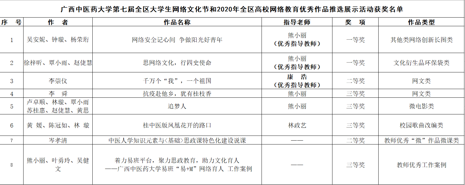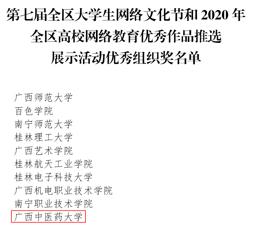 12月17日,自治区教育厅、自治区党委网信办下发《关于公布第七届全区大学生网络文化节和2020年全区高校网络教育优秀作品推选展示活动获奖名单的通知》(桂教思政〔2020〕21号),其中,我校在微电影、校园歌曲、文化衍生品、优秀工作案例等7类作品征集活动中,取得了2个一等奖、2个二等奖、4个三等奖的佳绩,2位老师获评为优秀指导教师。同时,我校荣获“优秀组织奖”。