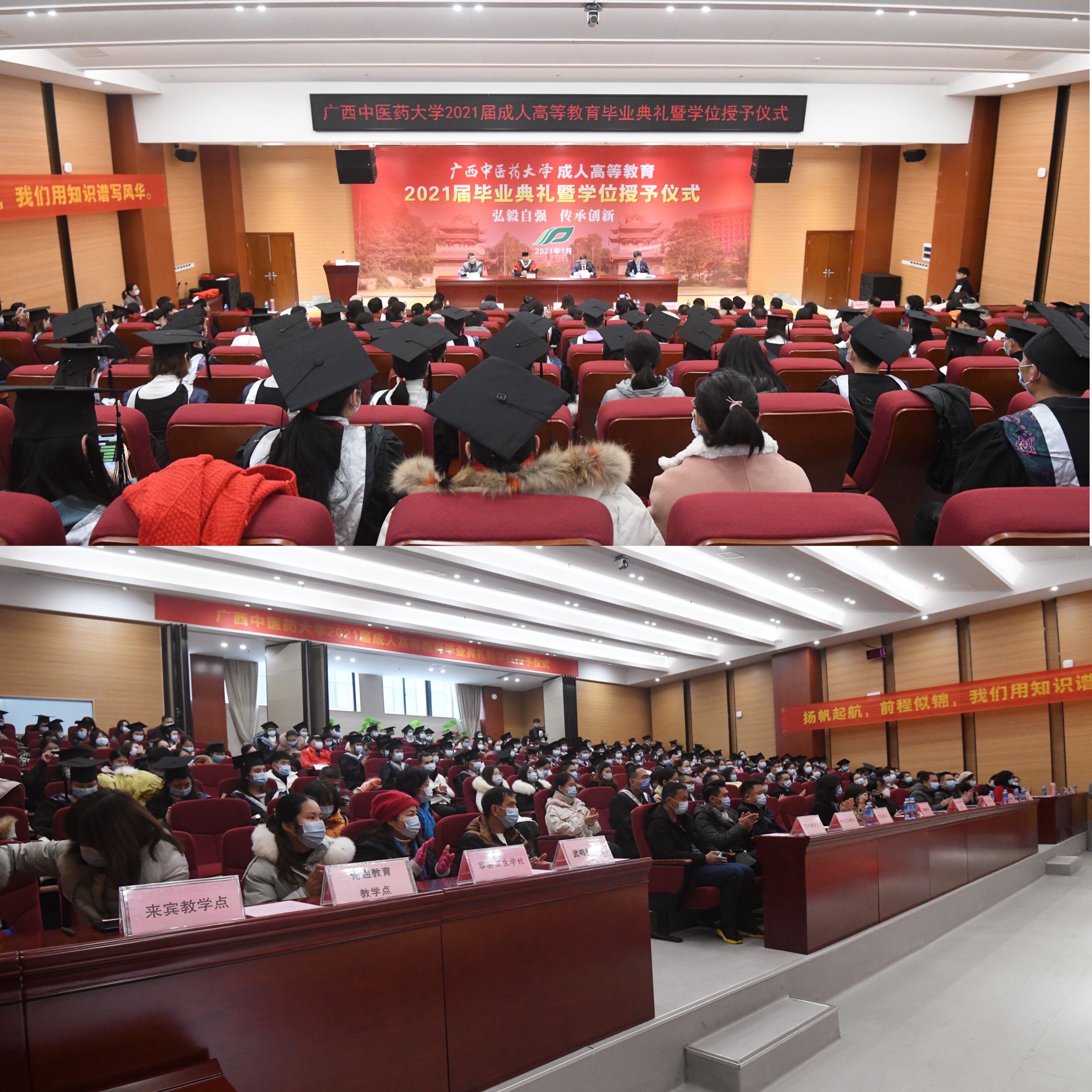 1月9日上午,学校成人高等教育2021届毕业生毕业典礼暨学位授予仪式在明秀校区国教院大楼学术报告厅举行,学校副校长戴铭出席典礼并致辞。直属党总支书记、成人教育学院院长韦艾凌、直属党总支副书记、成人教育学院副院长覃振林、成人教育学院副院长黄瑞诚、成教院全体班主任、2021届优秀毕业生代表及教学点代表等参加了毕业典礼。典礼由黄瑞诚主持。