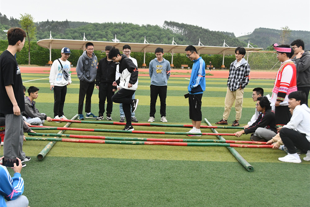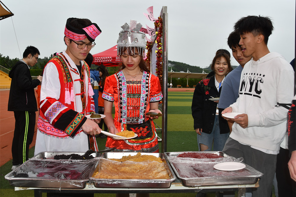 本次“壮族三月三”文化艺术节不仅有热情的山歌和舞蹈,还有独具特色的壮族美食品尝、壮医药作品展示以及壮族特色体育竞技。现场的壮族特色美食五色糯米饭、粽子和艾叶粑粑深受老师和同学们的喜爱。在体育竞技这一环节,富有壮族特色的抛绣球游戏、木板鞋接力、竹竿舞等体育竞技项目既富有挑战性,提高了同学们的身体素质,同时也感受到了壮族传统文化独特的魅力。