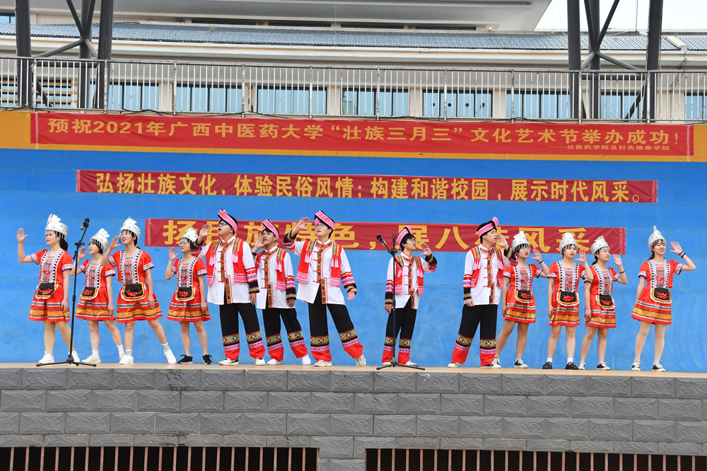 4月9日,星空彩票老版本下载仙葫校区运动场欢歌笑语,壮医药学院、针灸推拿学院2019、2020级200多名同学欢聚一堂,参加2021年星空彩票老版本下载“壮族三月三”文化艺术节。学校党委副书记庞宇舟、相关部门负责人参加了本次活动。