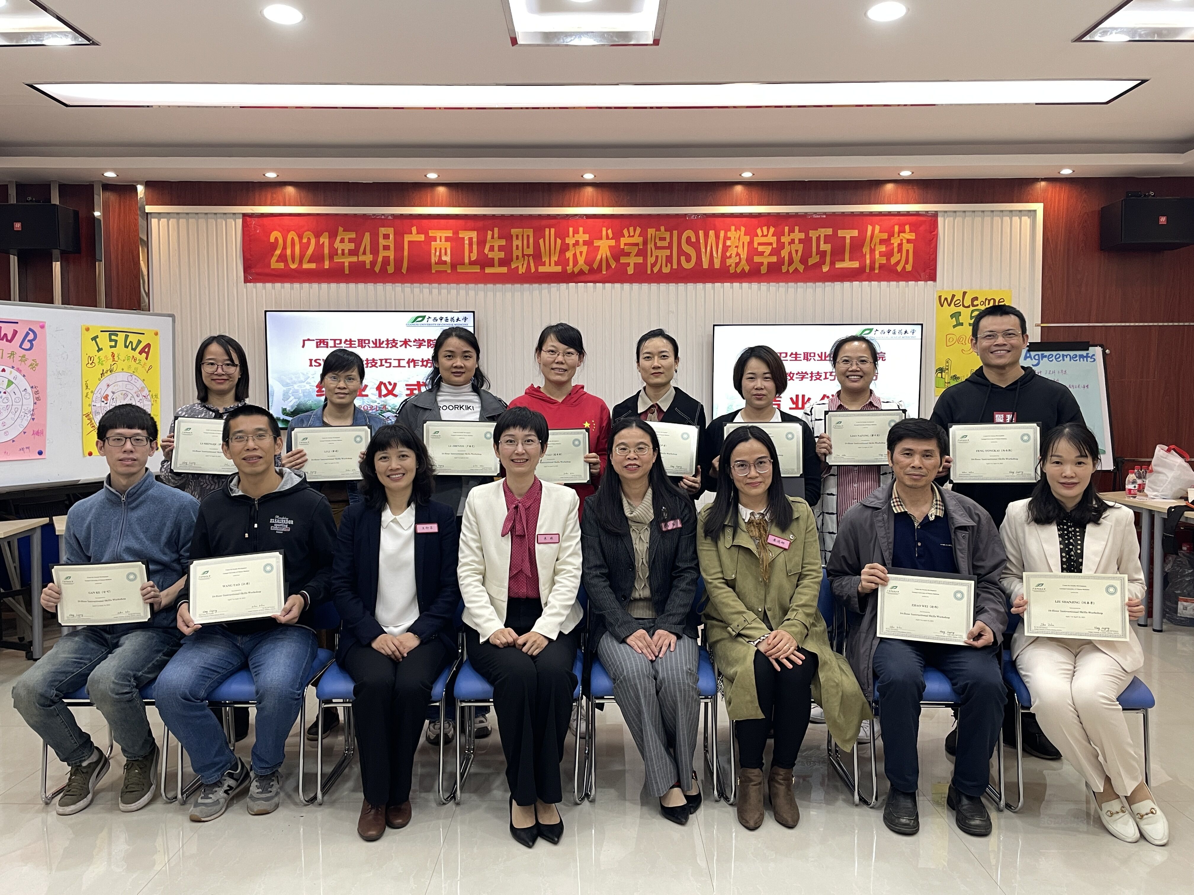 受广西卫生职业技术学院委托,我校于4月7日至10日在仙葫校区教学楼举办了“2021年广西卫生职业技术学院ISW教学技巧工作坊”。卫职院遴选了12位教师参加了工作坊,经过四天脱产密集培训,参训教师顺利通过培训,取得了结业证。