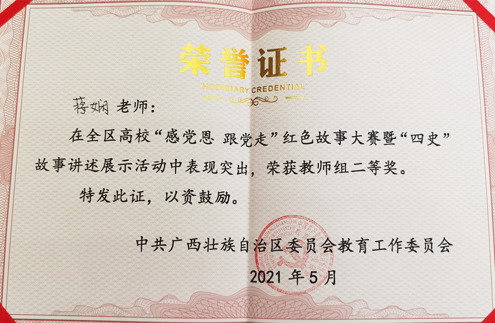 【喜讯】我校蒋娴老师荣获全区高校“感党恩 跟党走”红色故事大赛暨“四史”故事讲述决赛二等奖