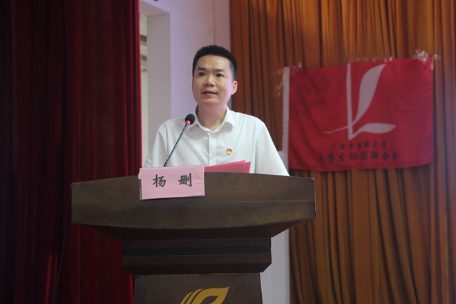 大会正式开始,全体起立奏唱《中华人民共和国国歌》。杨删在讲话中提出几点希望:一是提高政治地位,强化思想引领,把牢社团航行“方向盘”,在团委社团工作部和社团齐心协力下,共同推动我校社团文化建设迈向新的台阶。二是发挥团组织的引领作用,健全制度体系,打好社团发展“奠基石”,打造出更多有意义,有质量,精品化,品牌化的社团活动。三是充分发挥社团的育人功能,加强队伍建设,培养社团骨干“领头羊”,严把考核关,强化评价、激励作用。四是提升社团发展品味,培育示范项目,打造社团品牌“新名片”,持续加大对社团扶持力度,推进社团活动项目化管理,把手法、中草药、青年同伴、古琴等特色社团发展成为全区有影响力的社团。同时也希望各社团新任第一负责人能做好准备,抓住社团改革的机遇,让桂中医社团在新的时期取得新的发展,新的进步!