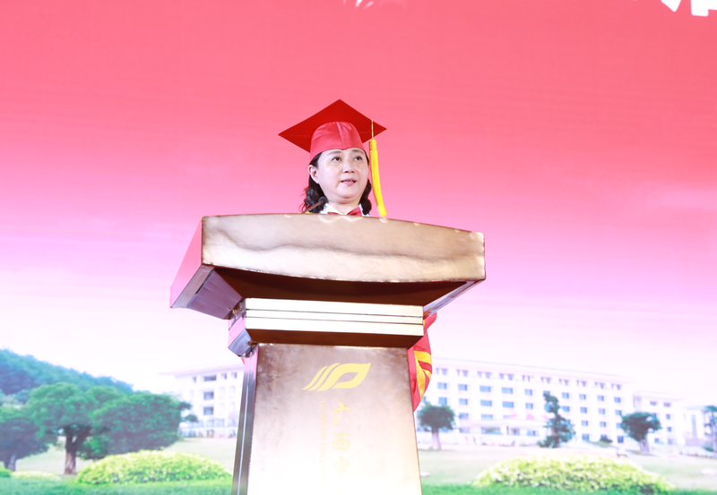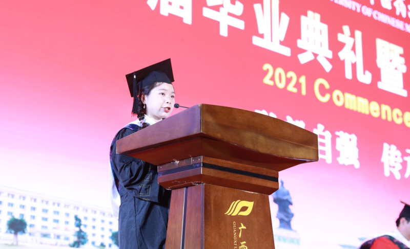 姚春以《逐梦新时代 奋进新征程》为题,向2021届毕业生深情送上临别寄语:“回望你们在桂中医的时光,我想,五和食堂的煲仔饭你们带不走,药师山的暮色你们带不走,阿平湖的草木你们带不走,满校的花香你们带不走。但你们可以带走的是,在桂中医获得的眼界、才情、气质,以及一代又一代桂中医人披荆斩棘、赓续奋斗的精神。我相信,它们终将融进你的血液,滋养你的气场,温润你的底蕴。”
