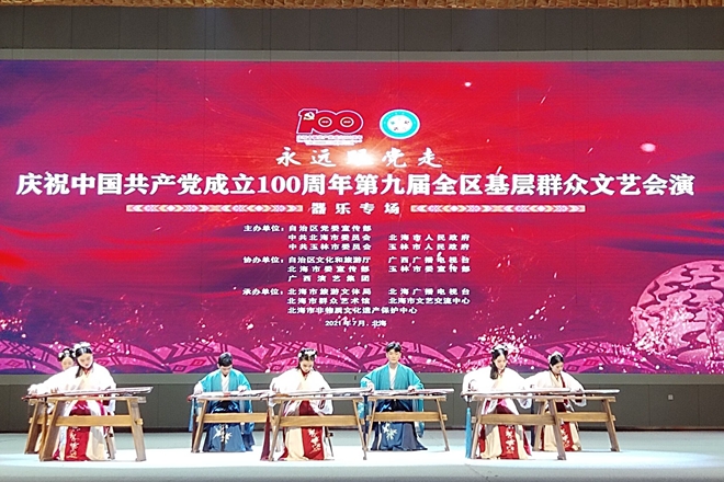 7月21-26日,由自治区党委宣传部主办的“永远跟党走”庆祝中国共产党成立100周年第九届全区基层群众文艺汇演盛大开幕,其中器乐类在北海市委党校举行,舞蹈类在玉林市文化艺术中心举行。我校大学生兰风古琴社选送作品《杏花天》,大学生艺术展演舞蹈团选送作品《呼吸》与全区各区直机关、市、县、院校等器乐、舞蹈节目同台竞技,为观众带来了一场艺术盛宴。