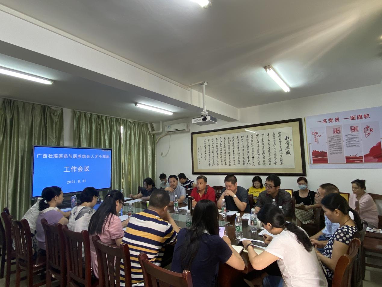 “广西壮瑶医药与医养结合人才小高地”是在2017年由自治区党委组织部和自治区人力资源社会保障厅认定为第七批自治区级人才小高地。为进一步推进“广西壮瑶医药与医养结合人才小高地”载体单位项目建设工作,8月31日,以我校瑶医药学院为载体单位之一的“广西壮瑶医药与医养结合人才小高地”全体成员在明秀校区召开2021年度项目载体单位工作推进会议。