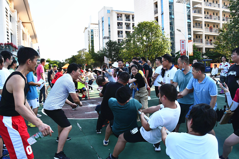 此次比赛采用三轮循环+淘汰赛制的形式举行,来自学校本部8个分工会组成的15支队伍共170多名教职工参加了比赛。比赛现场,参赛队员精神抖擞,磨拳擦掌。随着裁判的哨声响起,场上队员们紧握长绳,卯足了干劲。未参赛的教职工自发组成啦啦队为比赛队员加油助威,哨子声、呐喊声此起彼伏,现场气氛热烈。