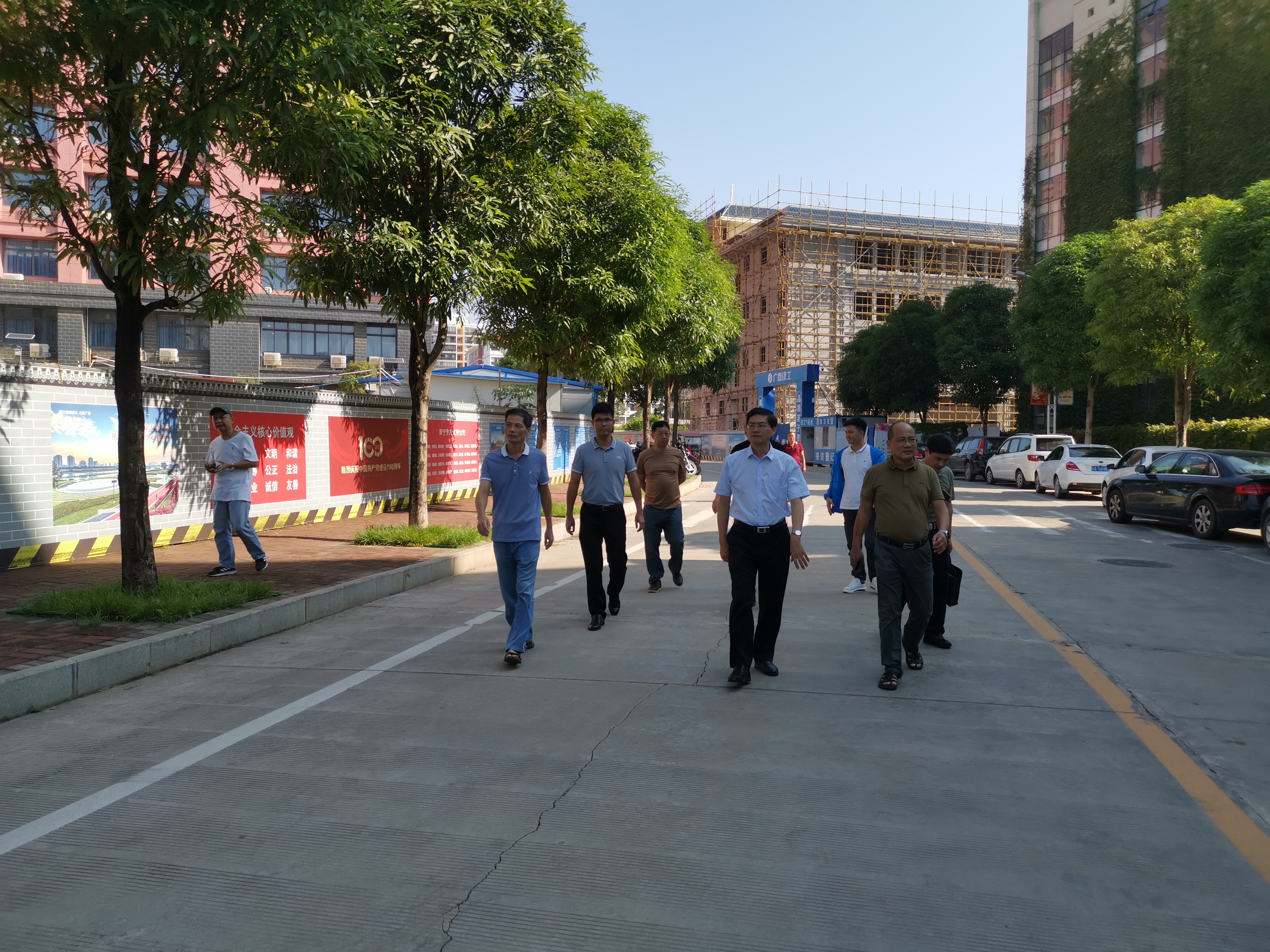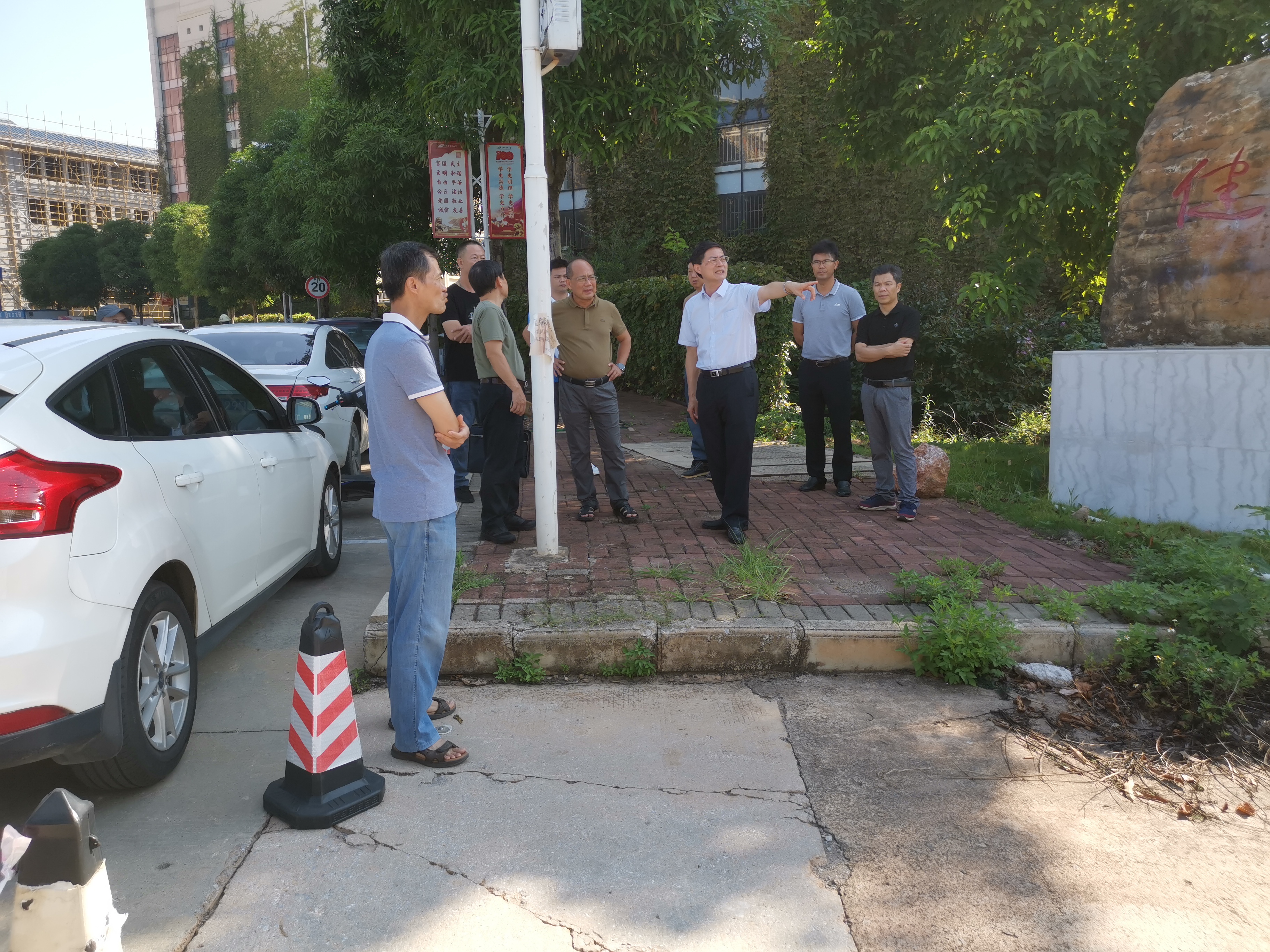 自诚楼建造没有规划有停车场,而附近的道路较窄、弯多坡陡,不适合设置停车位。为解决自诚楼上班教职员工停车难问题,上半年武装保卫部在确保通行安全和消防通道畅通情况下,在亲亲路上设置了部分临时停车位。但仍然无法满足自诚楼上班教职员工停车需求。为尽力解决师生身边困难,为民办好实事,何并文召集相关部门人员现场查看了自诚楼周边环境,查看师生员工出行通过道路、车辆停放、在建工地施工车辆出入情况,并到附近两个在建施工场地进行安全检查,听取了教职员工的意见。经过安全评估,综合考虑,最后现场研究确定把建设中的东盟医药文化交流中心北面空地平整出来,做为临时停车场,并明确由基建处协调和规划场地,后勤处进行平整,武装保卫部负责平时管理,分工合作,责任明确,确保工作落到实处,确实解决自诚楼上班教职员工停车难问题。