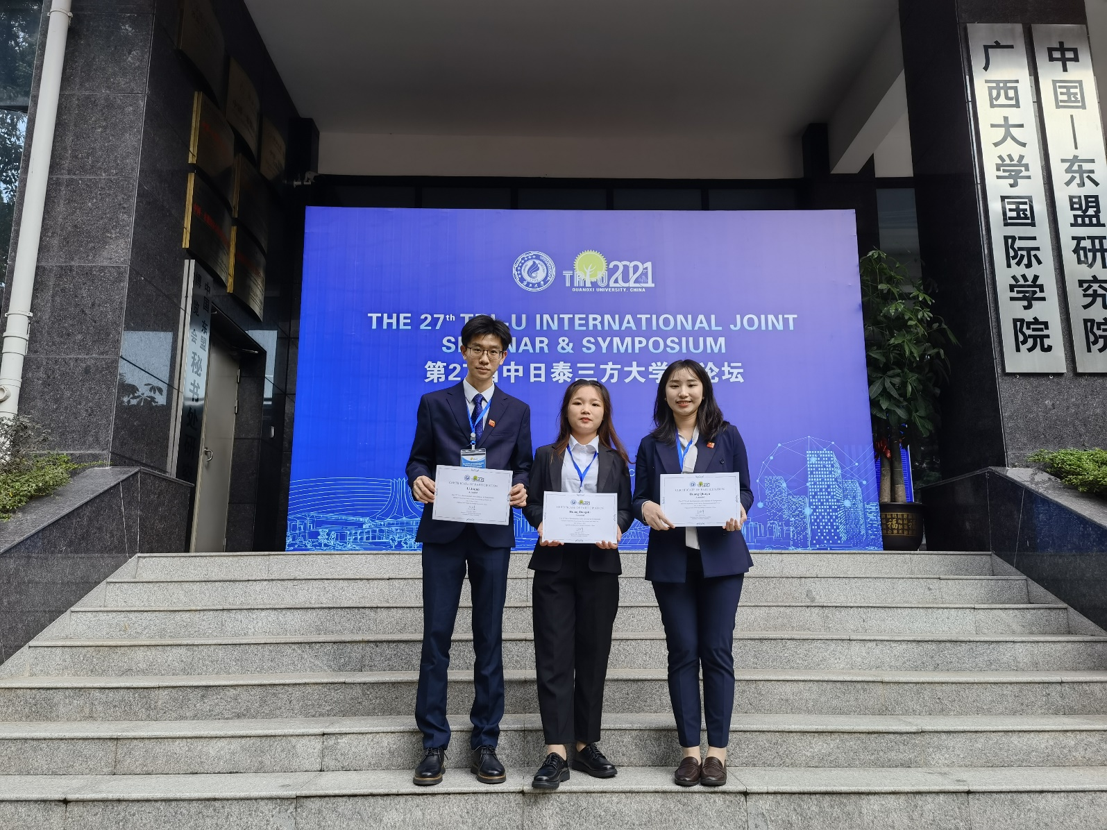 11月1日至11月4日,应广西大学邀请,我校瑞康临床医学院2017级临床医学专业黄倩钰、李嘉骏同学,2018级临床医学专业黄东识同学在瑞康临床医学院汪国翔、国际教育学院文娟老师的带队下参加由广西大学主办的第27届中日泰三方大学生论坛。本次论坛的形式为线下线上相结合,有来自中国、泰国、印度尼西亚、俄罗斯、日本、新加坡等国家的12所高校共计一百多名师生参与。