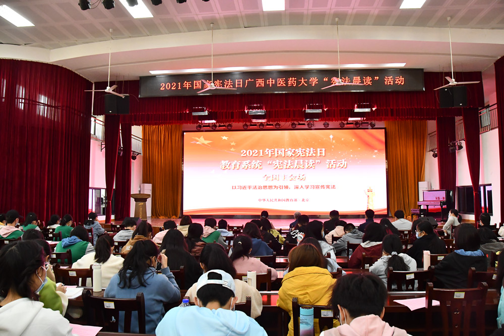 12月4日是我国第八个“国家宪法日”。为迎接第8个国家宪法日,进一步普及宪法知识、弘扬宪法精神、树立宪法权威,教育部3日在北京主会场举办教育系统“宪法晨读”活动,自治区教育厅、自治区高级法院、自治区检察院、自治区司法厅、共青团广西区委、自治区妇联联合在南宁市五象新区第三实验小学设立2021年国家宪法日教育系统宪法晨读活动广西分会场,我校在仙葫校区大学生活动中心小礼堂设立分会场,近200名师生与北京主会场同步开展“宪法晨读”活动。