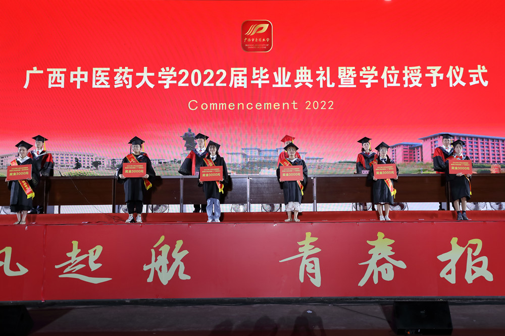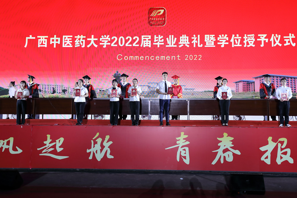 仪式上,冷静宣读毕业文件、学位授予文件。覃宇环宣读优秀毕业生表彰决定及西部计划志愿者名单。主席台上的领导为自治区级优秀毕业生获得者、西部志愿者分别颁奖。
