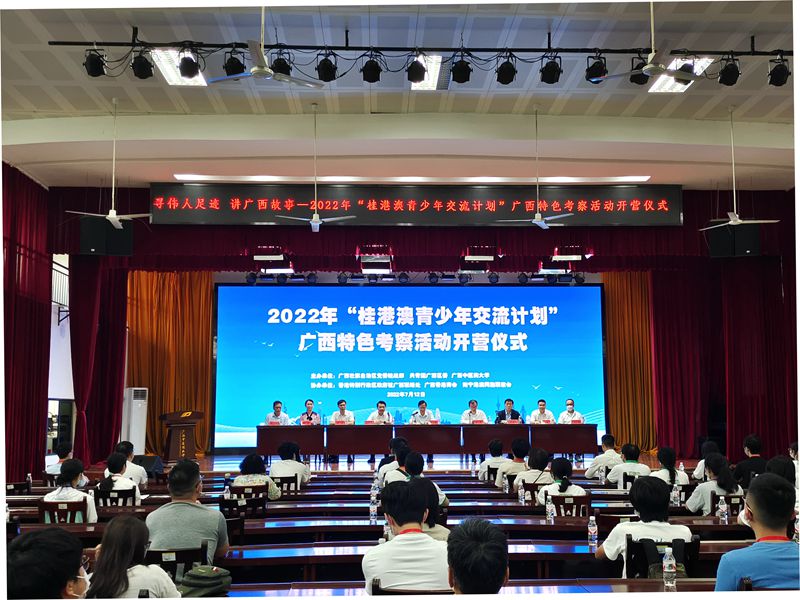 为深入贯彻落实习近平总书记在庆祝香港回归祖国25周年大会上的重要讲话精神,让在桂的港澳青年学生近距离感悟广西厚重的历史积淀和悠久的民族文化,真切感受中国特色社会主义壮美广西建设成就,不断增强对伟大祖国、中华民族的认同感和自豪感。7月12日上午,由自治区党委统战部联合共青团广西区委、星空彩票老版本下载共同举办的2022年“桂港澳青少年交流计划”广西特色考察活动开营仪式在我校仙葫校区大学生活动中心A座小礼堂举行。