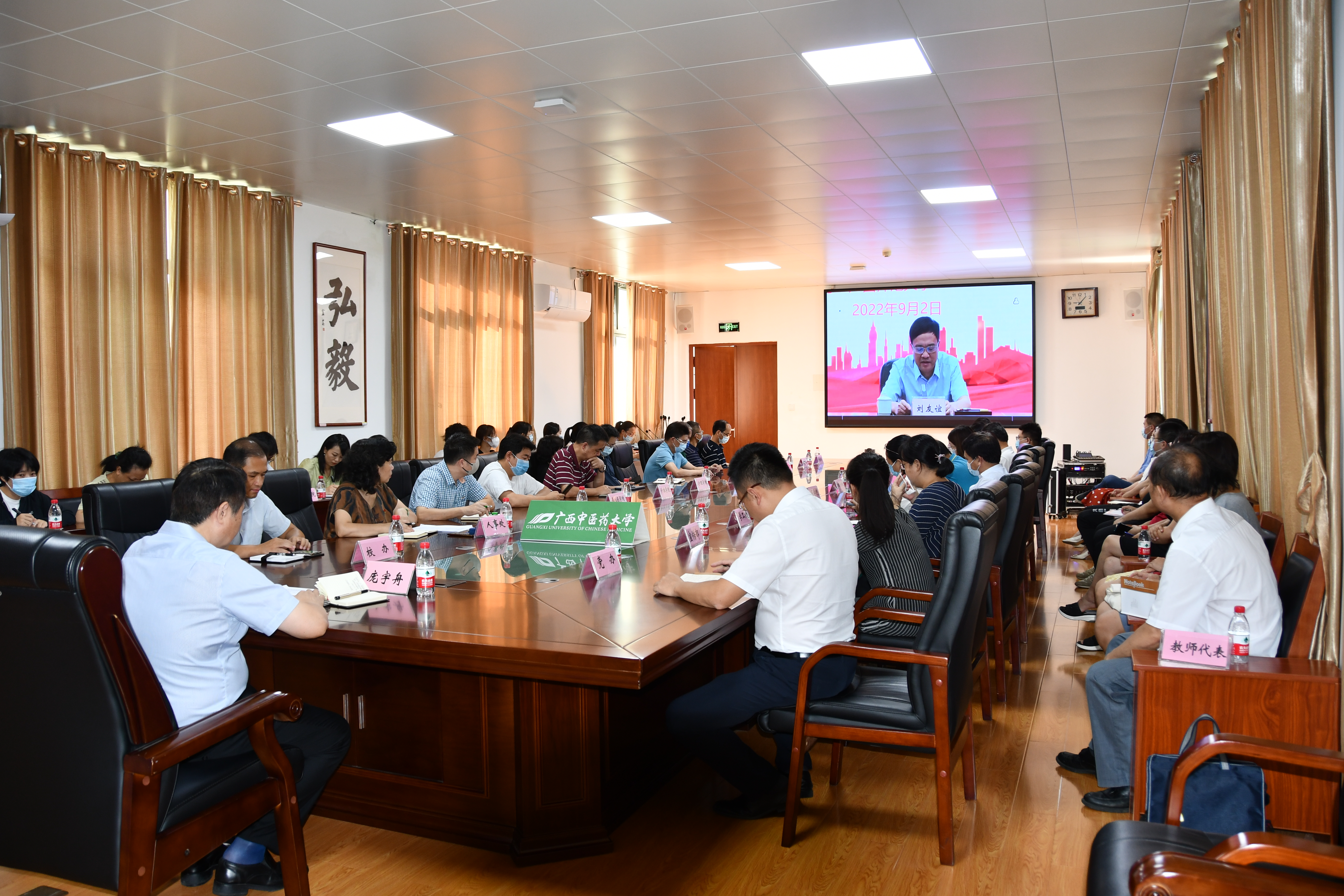 为庆祝第38个教师节,加大优秀教师宣传,强化师德师风建设,自治区教育厅举行“迎接党的二十大 培根铸魂育新人”主题师德巡讲活动。9月2日上午,首场报告会在南宁举行。我校在仙葫校区合德楼525会议室设立分会场,学校党委副书记庞宇舟,各相关职能部门负责人,各学院、教学部负责人和教师代表、学生代表共50多人一同观看了报告会。