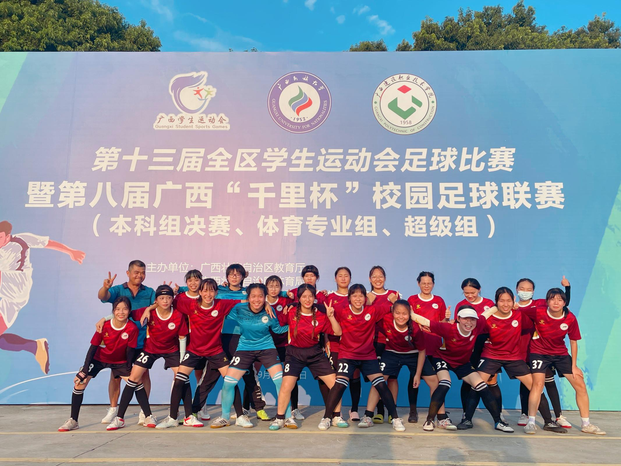 2022年9月2日—9月9日,在这秋高气爽,艳阳高照的时节,广西壮族自治区第十三届全区学生运动会足球比赛暨第八届广西“千里杯”校园足球联赛(本科组决赛、体育专业组、超级组)在海浪体育训练基地成功举办。本次比赛由广西壮族自治区教育厅、体育局、中国共产主义青年团广西壮族自治区委员会主办,广西民族大学、广西建设职业技术学院承办,广西学校体育卫生艺术学会协办。本次足球比赛是学生运动会最后一个比赛项目,共有全区23所高校的33支足球队伍参加,经过6天6场在绿茵场上的激烈角逐,我校女足荣获本科组女足比赛的第六名和体育道德风尚奖。