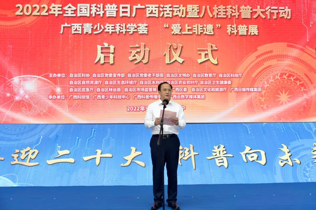 9月15日,以“喜迎二十大,科普向未来”为主题的2022年全国科普日广西活动暨八桂科普大行动在南宁启动,自治区副主席许显辉致辞并宣布活动启动,自治区科协党组书记、副主席纳翔主持启动仪式。