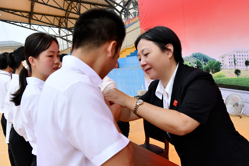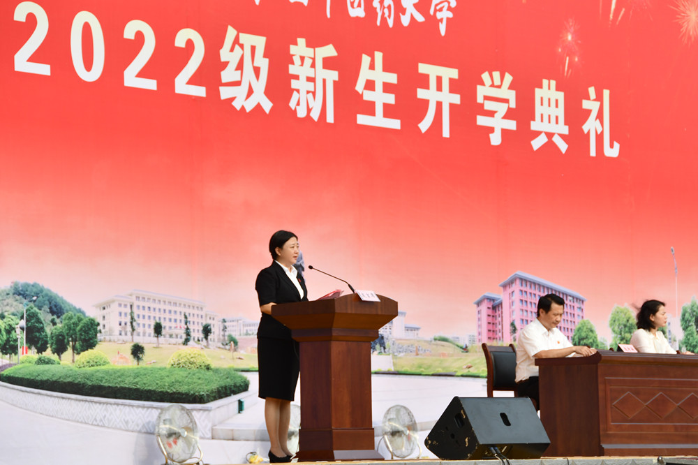 开学典礼上,学校领导为2022级新生代表佩戴校徽,庞宇舟带领新生领誓医学生誓言。教师代表药学院田慧、在校生代表2019级公共事业管理专业姜显春、研究生新生代表2022级中药学硕士研究生黄泽泉和本科新生代表2022级中医学(“5+3”一体化)专业陈文宇分别在开学典礼上进行了发言。