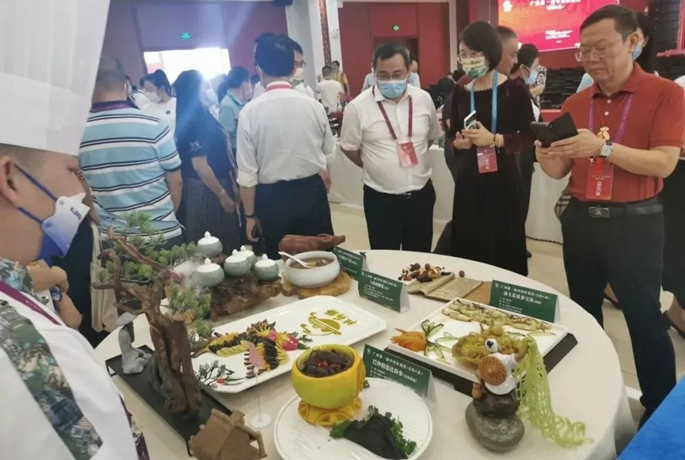 本次药膳大赛由中国药膳研究会指导,自治区卫生健康委、自治区中医药局、自治区市场监管局、自治区总工会共同主办,广西职业技术学院、广西药用植物园承办,南宁市卫生健康委、南宁经开区卫健局协办。大赛以“传承药膳文化,助力健康广西”为主题,旨在通过组织举办大赛竞技活动,营造浓厚的中医药传统文化氛围,探索中药壮瑶药药膳推广应用,检验药膳研究成果,逐步研发出安全、有效的药膳系列产品,提高药膳人才服务能力,充分发挥中药壮瑶药药膳在养生保健疗疾中的特色优势。来自全区14个市共451支初赛队伍,经过层层选拔,共遴选出48个代表队参加决赛,比赛分为“理论知识竞赛”和“技能实操竞赛”两部分。来自全区药膳代表队同台竞技,分别围绕中医体质、节气养生和常见病症,依据中医药理,以新鲜食材和中药壮瑶药为原料设计菜品。近200道药膳菜品创意层出不穷,造型优美,工艺考究,独具匠心,一道道药膳美食香气四溢,比赛现场犹如“百家宴”,呈现出药借食力、食助药威、相辅相成、相得益彰的美食盛宴,再加上独具中医药内涵功效的解说,让现场嘉宾在满足味蕾之时,更收获健康养生和药膳食补的功效。
