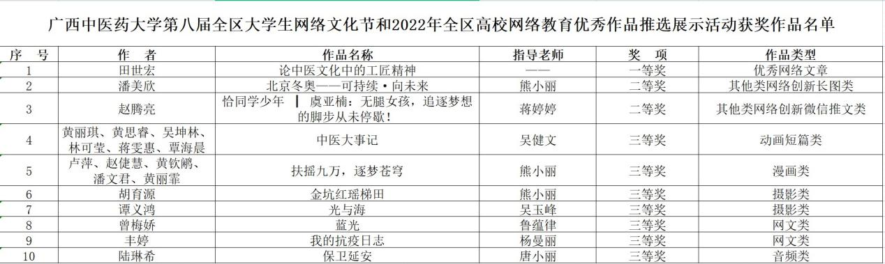 近日,自治区教育厅、自治区党委网信办下发《关于公布第八届全区大学生网络文化节和2022年全区高校网络教育优秀作品推选展示活动获奖名单的通知》(桂教思政〔2022〕28号),其中,我校在动漫作品、摄影作品、网文作品、音频作品等6类作品征集活动中,取得了1个一等奖、2个二等奖、7个三等奖的佳绩。