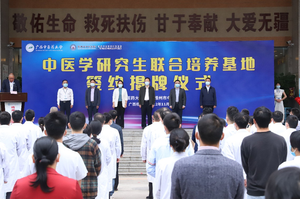 2022年11月16日,学校党委书记莫锦荣一行15人赴梧州参加“星空彩票老版本下载中医学研究生联合培养基地”签约与挂牌仪式。梧州市委常委、副市长文峰,梧州市政府副秘书长刘念;梧州市卫生健康委党组书记、主任宁金沛;梧州市中医医院党委书记梁平、院长卢正等领导,基地相关职能科室负责人、导师代表以及全体研究生代表出席和参加了此次活动。