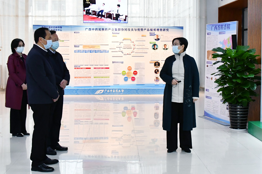 在学校党委书记莫锦荣、校长姚春等校领导的陪同下,许显辉来到广西中医药科学实验中心,先后参观了科技成果展厅、广西中药药效研究重点实验室、石墨烯生物医药应用技术研究院等,深入了解了“桂十味”研究、大健康产业、中药壮瑶药创新药物教育部工程研究中心等科研平台建设情况,听取了莫锦荣、姚春等关于学校发展情况的汇报。