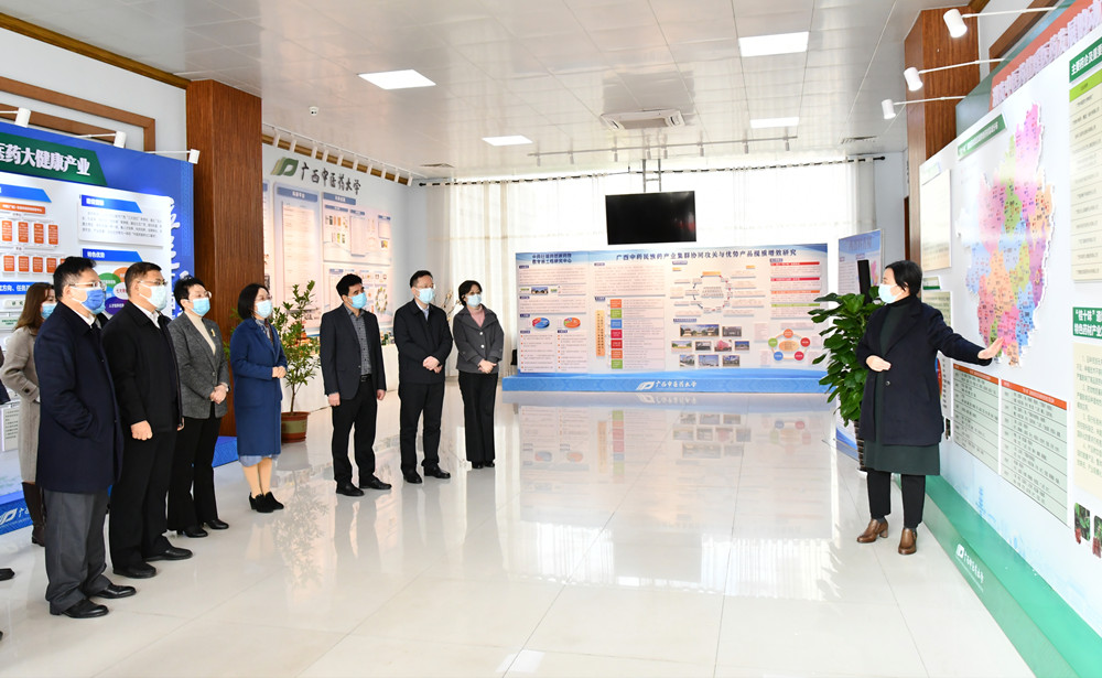 在学校党委书记莫锦荣、校长姚春、副校长冷静、总会计师何刚亮等的陪同下,文信连一行先后参观了学校教师教学发展中心、广西中医药科学实验中心、广西中药药效研究重点实验室、广西壮瑶药重点实验室等地。