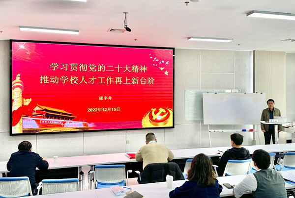 12月15日下午,人事处党支部、教务教评党支部、科技处党支部联合开展了 “学习党的二十大精神”主题党日活动。校党委副书记庞宇舟以“学习贯彻党的二十大精神,推动学校人才工作再上新台阶”为主题作了专题辅导报告。三个党支部的党员及入党积极分子共39人参加了活动。