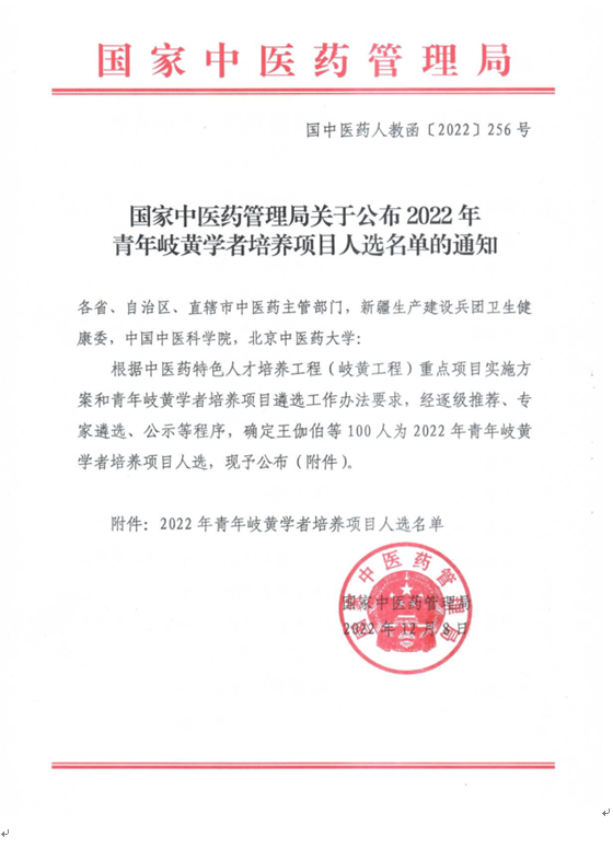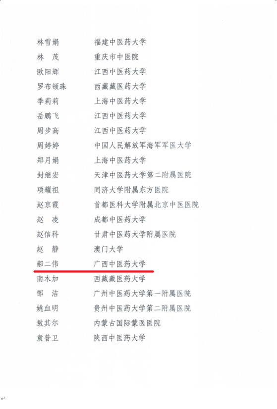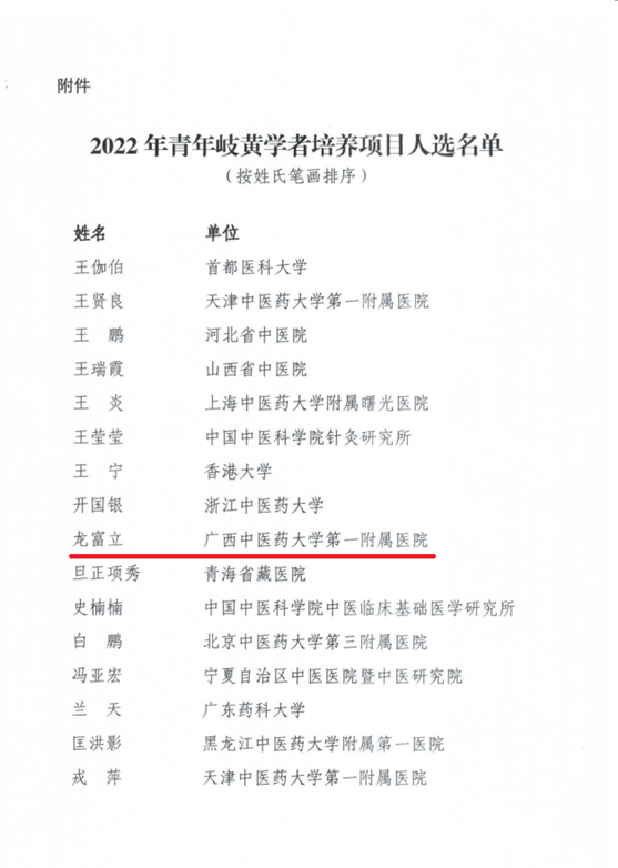 近日,国家中医药管理局印发了《国家中医药管理局关于公布2022年青年岐黄学者培养项目人选名单的通知》(国中医药人教函〔2022〕256号),公布了100名国家中医药管理局2022年青年岐黄学者培养项目人选名单,此次广西共2人入选,分别为我校科学实验中心郝二伟研究员、第一附属医院龙富立主任医师。