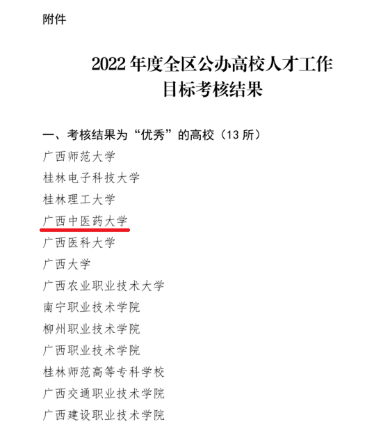 近日,自治区党委教育工委、自治区教育厅印发《关于公布2022 年度高校人才工作目标考核结果的通知》,我校在2022年度广西高校人才工作目标考核中荣获“优秀”等级。