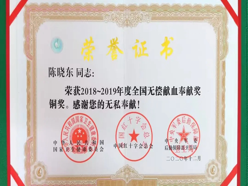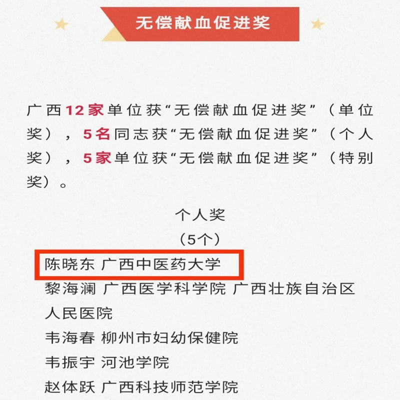 2023年2月7日,经地方推荐、部门审核、社会公示,国家卫生健康委、中国红十字会总会、中央军委后勤保障部卫生局决定,对2020-2021年度在无偿献血工作中作出突出成绩的地方、单位和个人作出了表彰,我校团委宣传部、社团工作部部长陈晓东老师荣获“全国无偿献血促进奖”。